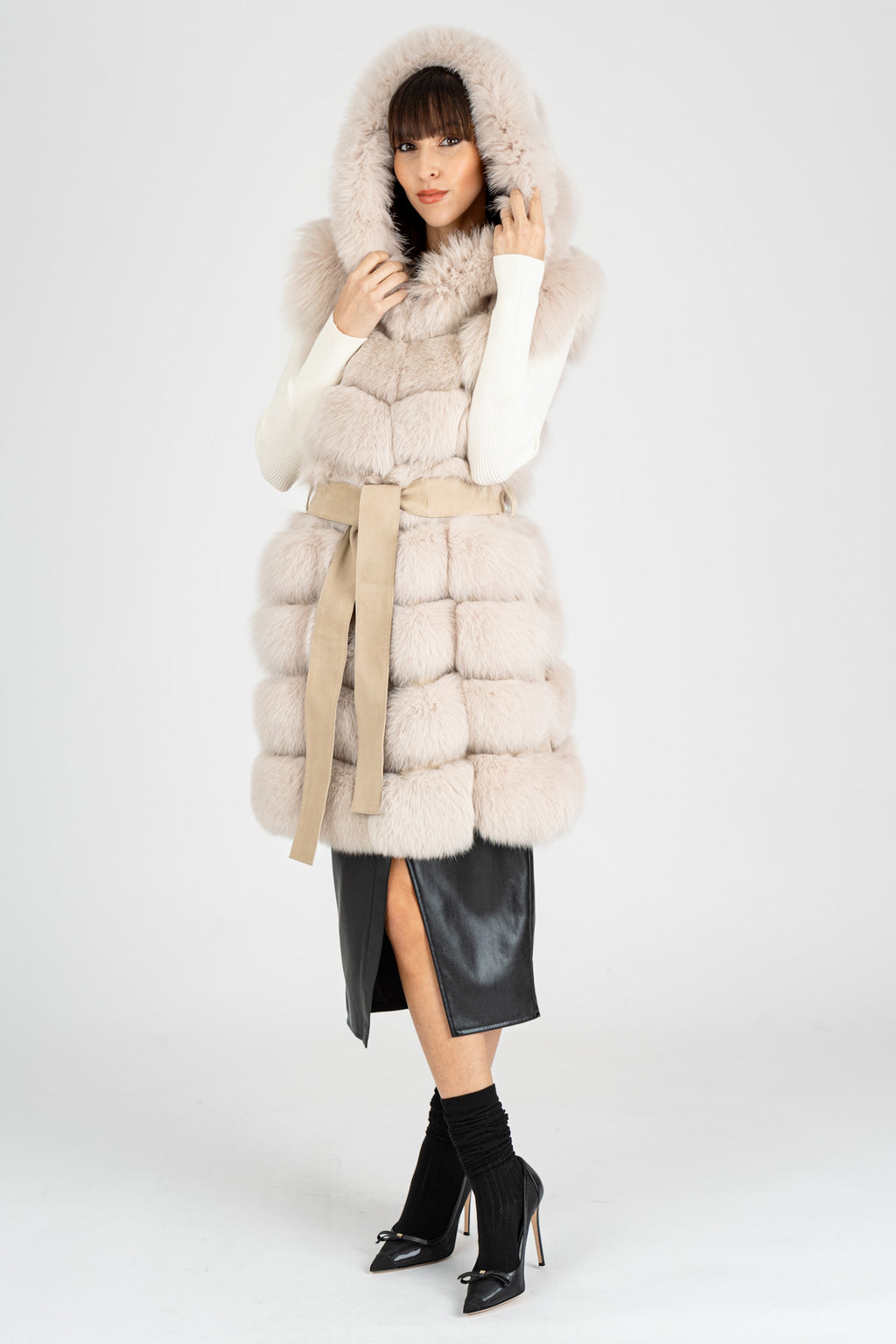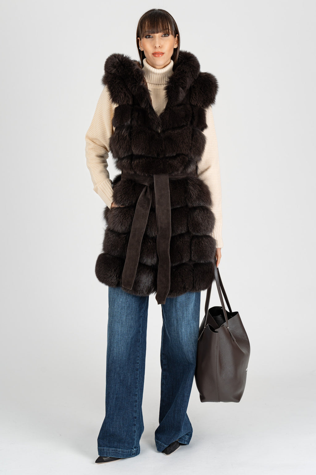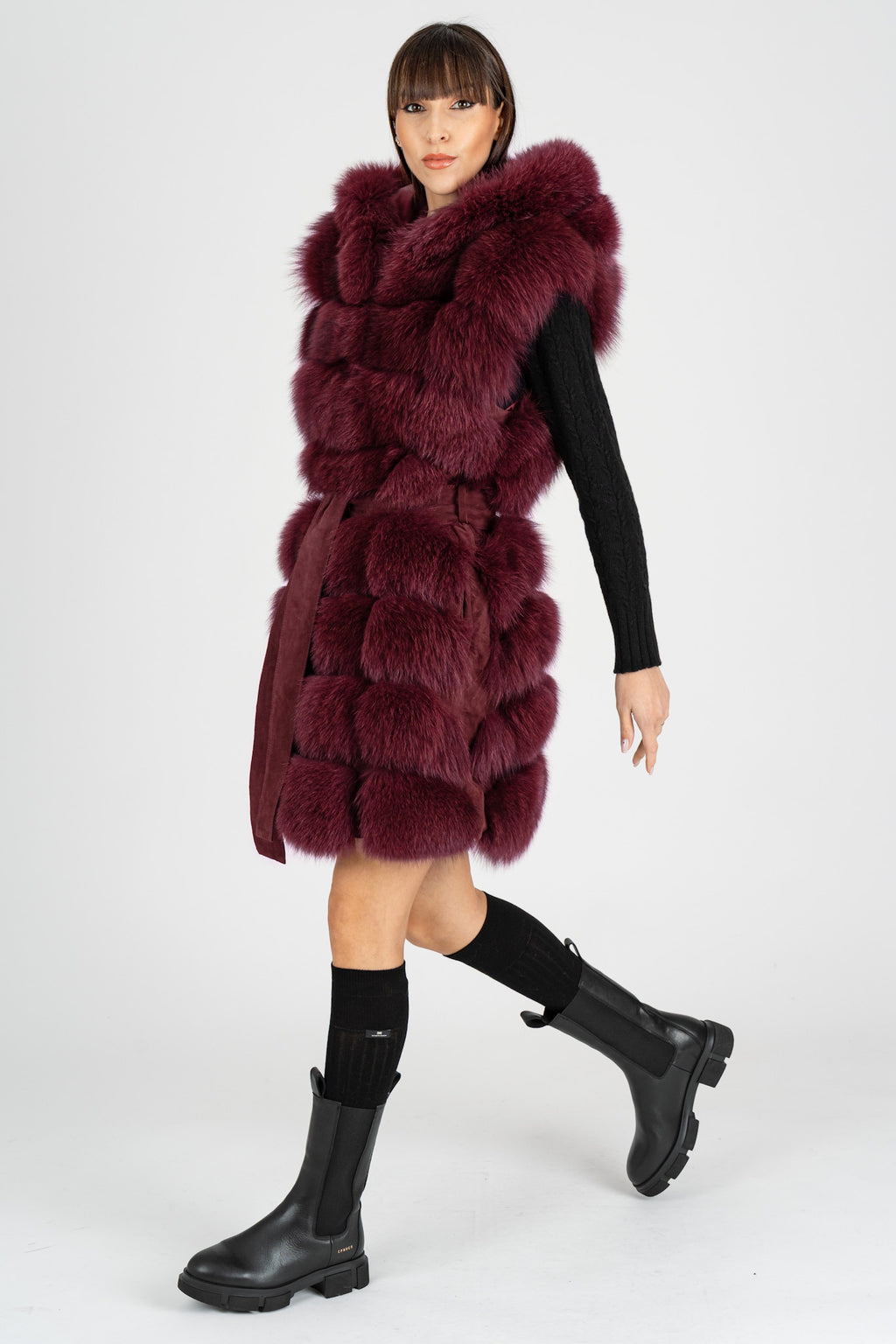 Gilet in Pelliccia con Cappuccio Bordeaux